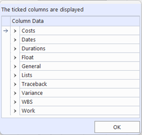 ➡️ Navigate: Right click on existing Gantt Headings > Select from column selection dropdown menu > Click OK