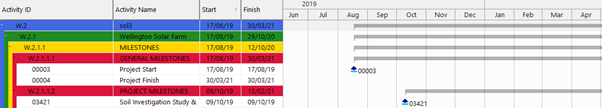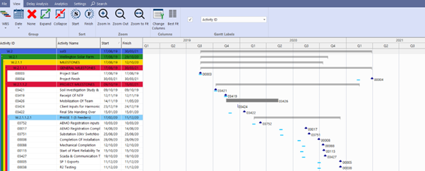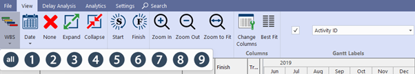 Click all or one of the levels (1-9) to display the required WBS levels and activities on the Gantt chart.